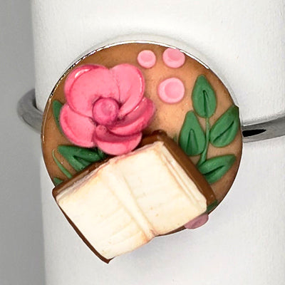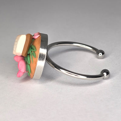 Caring for your polymer clay ring easy. To dust, use a soft clean makeup brush and lightly brush over it or run it under cold water and let it drip dry. Long exposure to water is not advised, however it is waterproof so you can wash your hands, have a shower or even go swimming. Whilst Polymer Clay is pretty sturdy once baked, it is still very fragile, never apply unnecessary pressure or tension to your item.