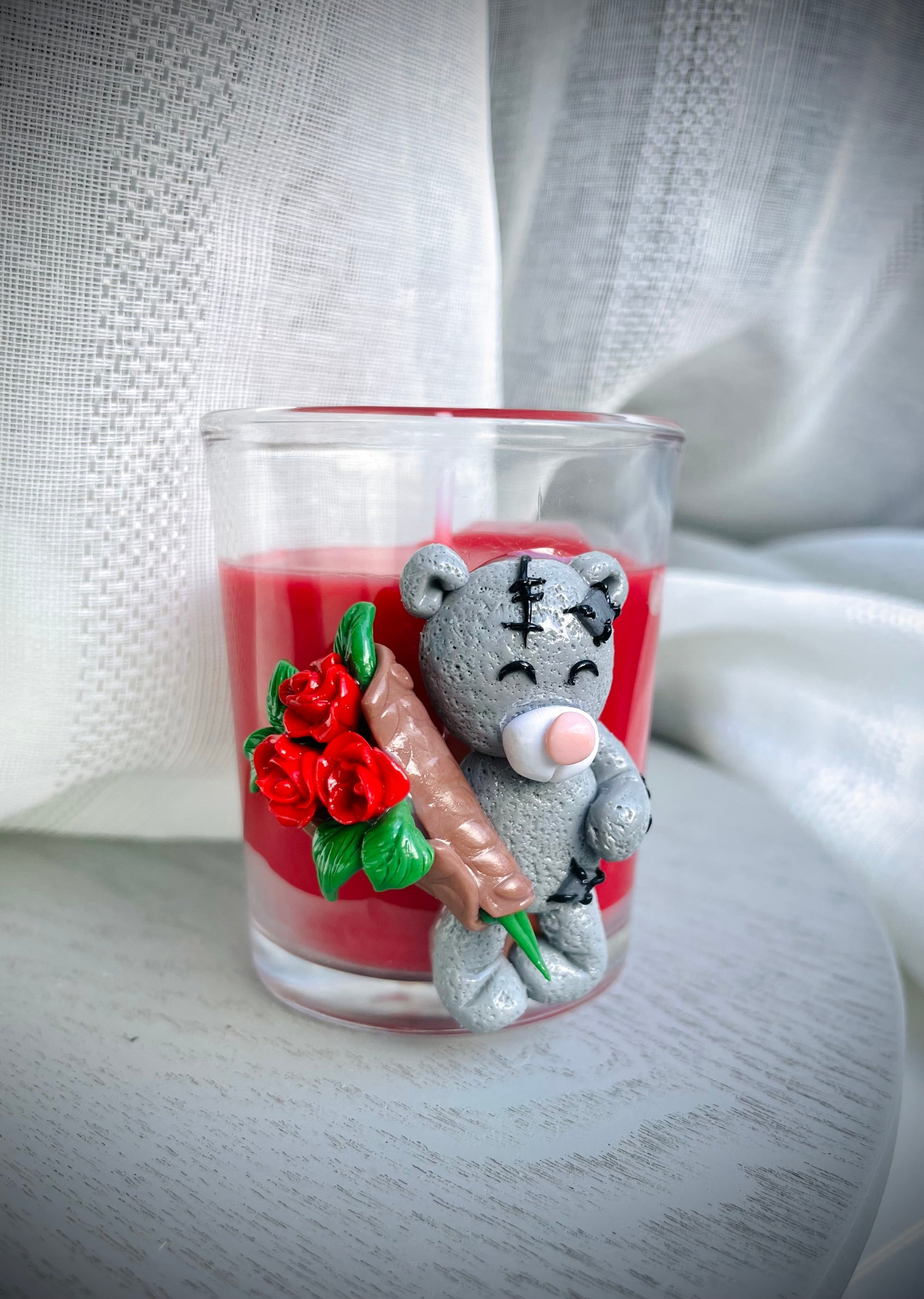 This item has been handmade and is a one of kind, unique creation. Red candle in glass holder. Candle scent: berry strawberry. Total height: 7cm.