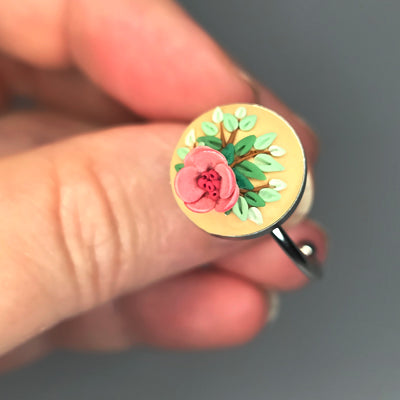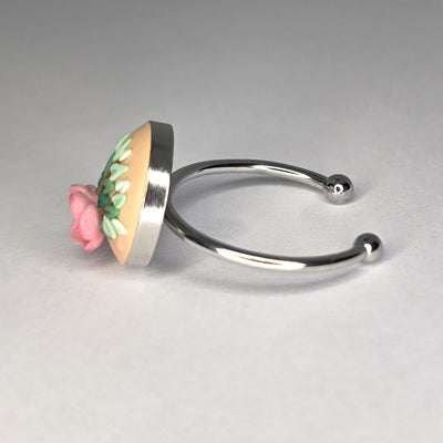 Caring for your polymer clay ring easy. To dust, use a soft clean makeup brush and lightly brush over it or run it under cold water and let it drip dry. Long exposure to water is not advised, however it is waterproof so you can wash your hands, have a shower or even go swimming. Whilst Polymer Clay is pretty sturdy once baked, it is still very fragile, never apply unnecessary pressure or tension to your item.