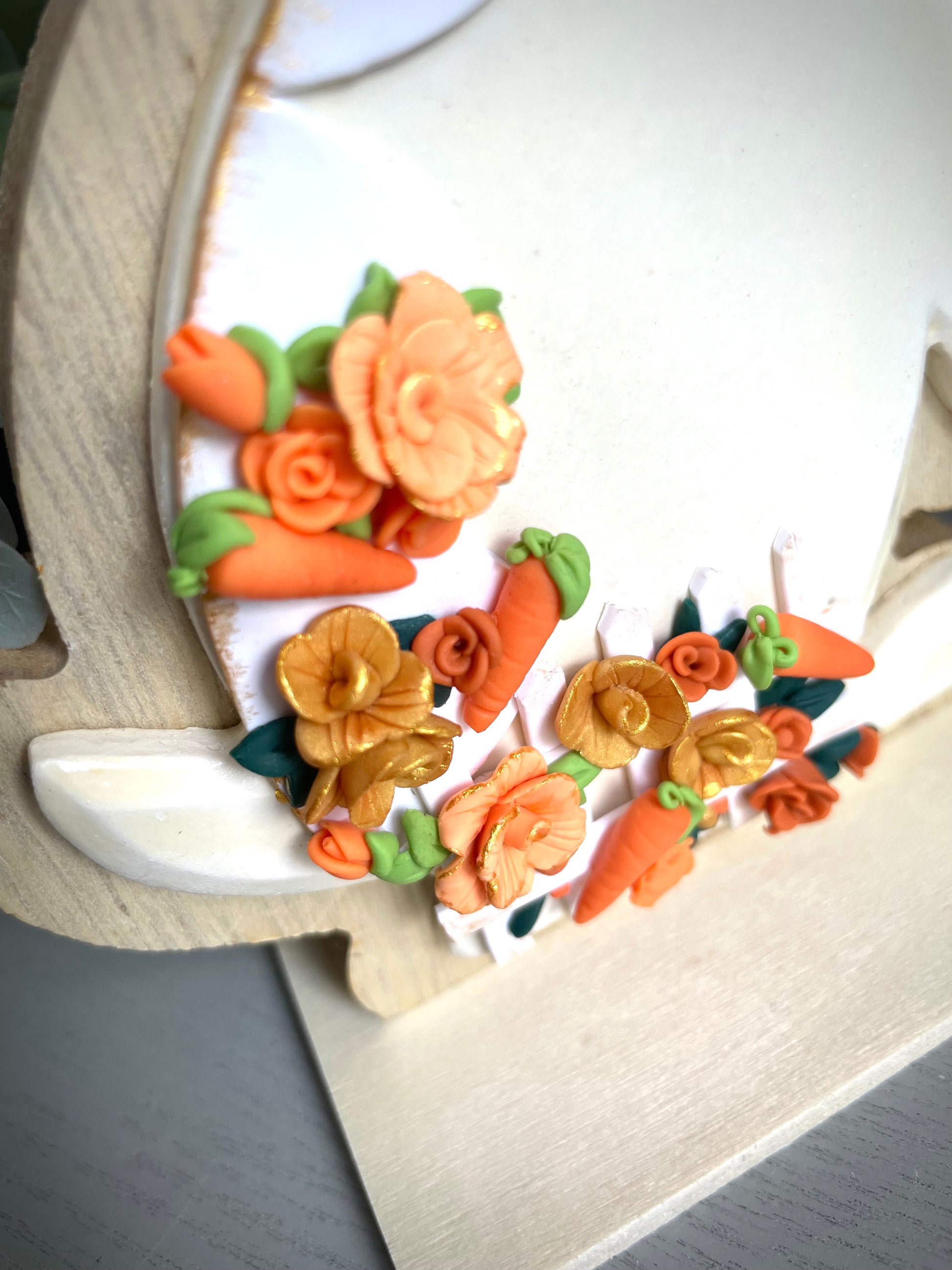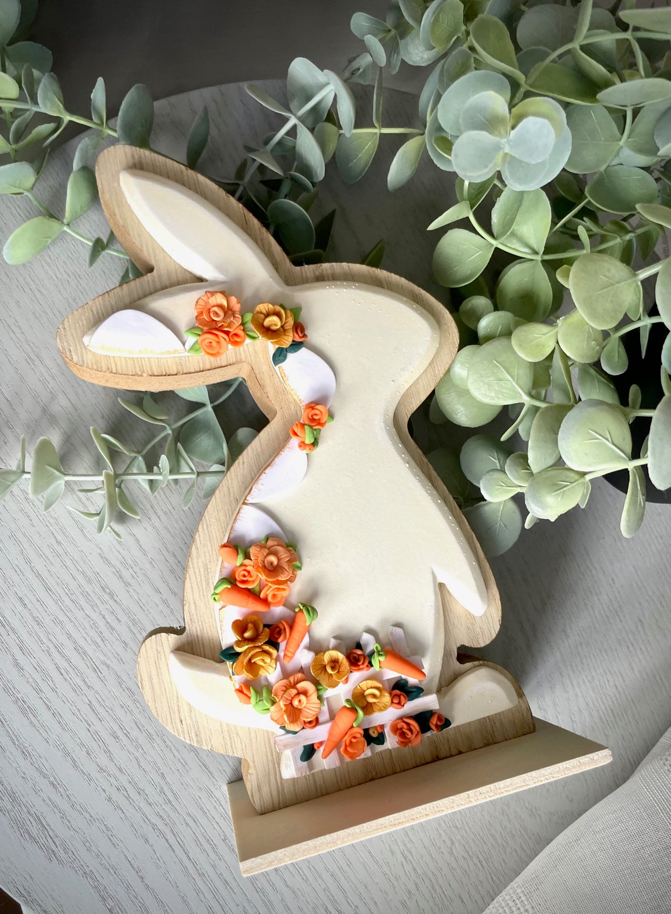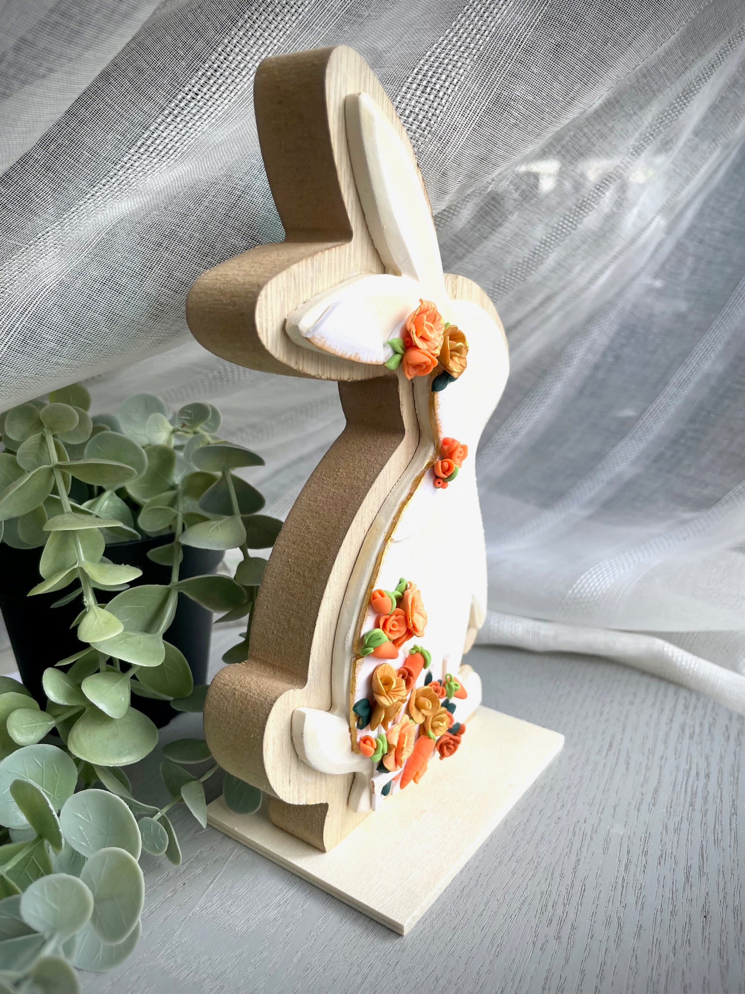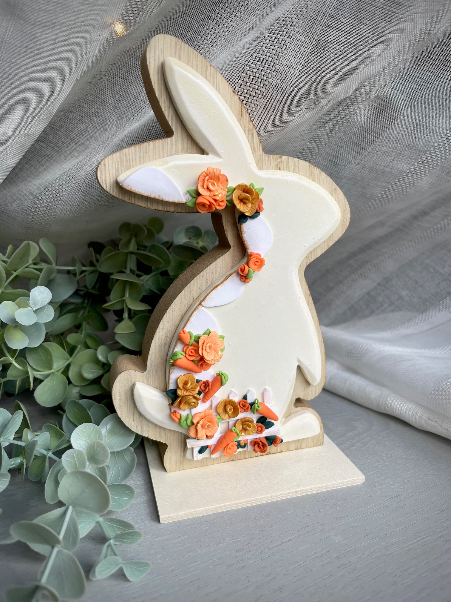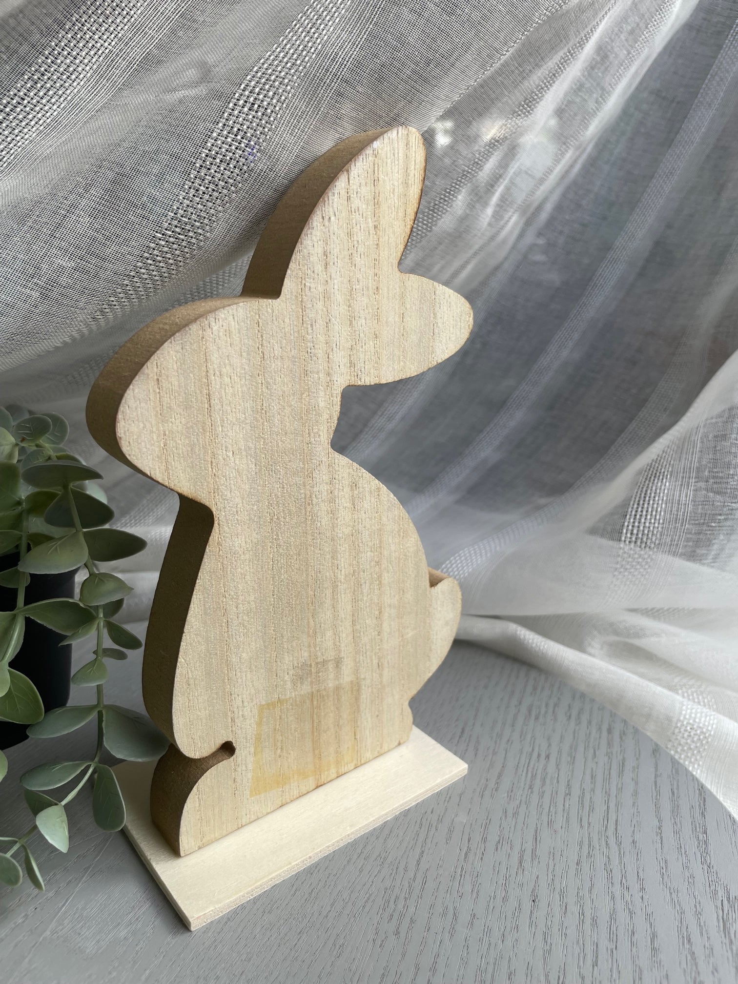Ceramic bunny on a timber backing and stand. 21cm tall and 11cm at it's widest point.