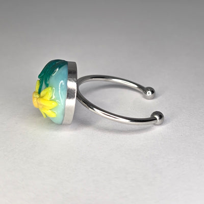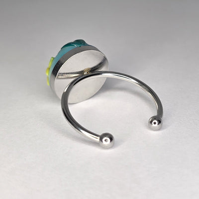 Caring for your polymer clay ring easy. To dust, use a soft clean makeup brush and lightly brush over it or run it under cold water and let it drip dry. Long exposure to water is not advised, however it is waterproof so you can wash your hands, have a shower or even go swimming. Whilst Polymer Clay is pretty sturdy once baked, it is still very fragile, never apply unnecessary pressure or tension to your item.