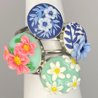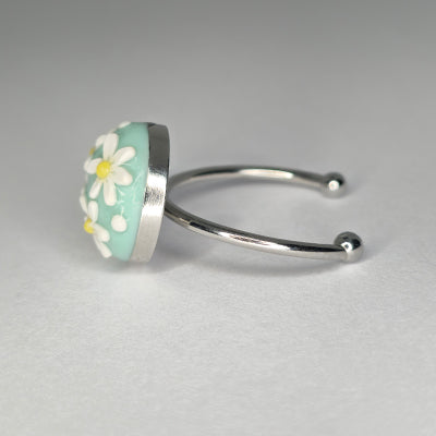 Caring for your polymer clay ring easy. To dust, use a soft clean makeup brush and lightly brush over it or run it under cold water and let it drip dry. Long exposure to water is not advised, however it is waterproof so you can wash your hands, have a shower or even go swimming. Whilst Polymer Clay is pretty sturdy once baked, it is still very fragile, never apply unnecessary pressure or tension to your item.