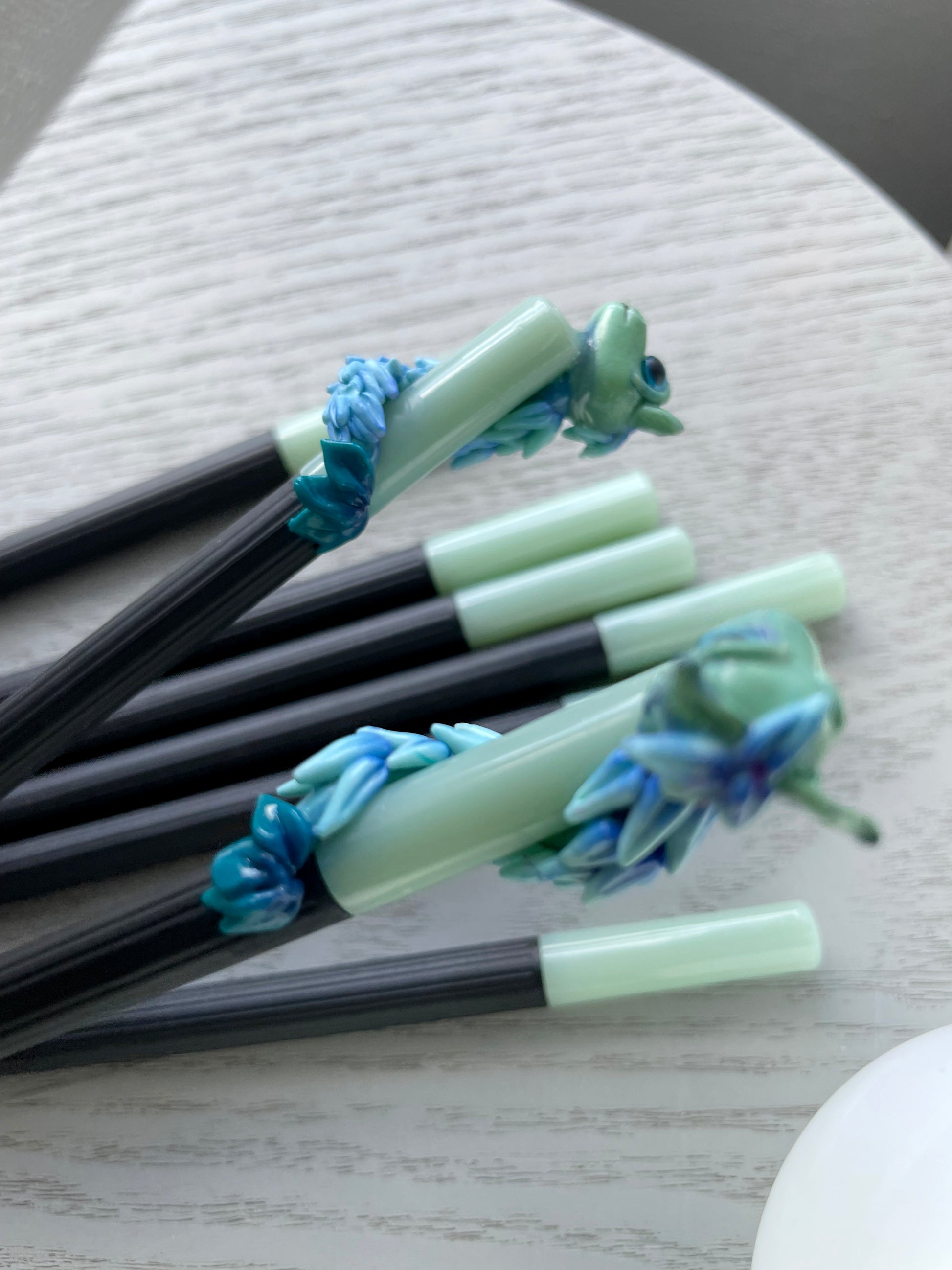This is a set of 8 chopsticks with soft jade tips, two featured with a dragons head to celebrate the Chinese Year of the Dragon 2024.