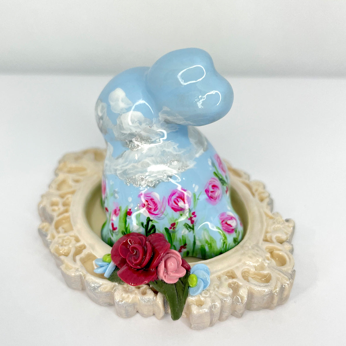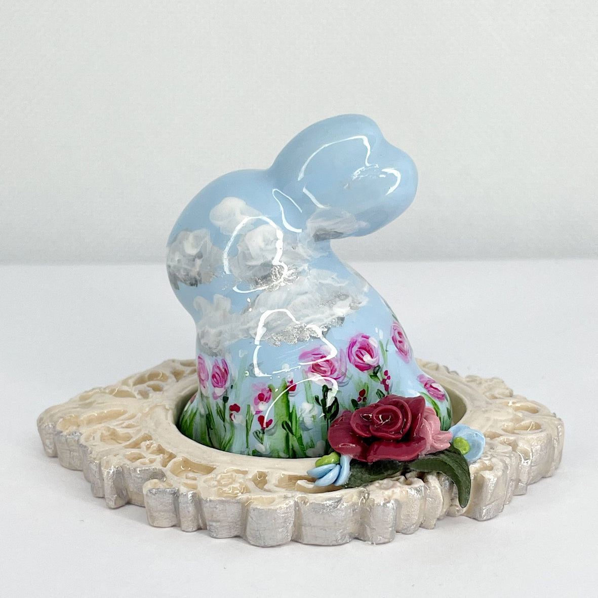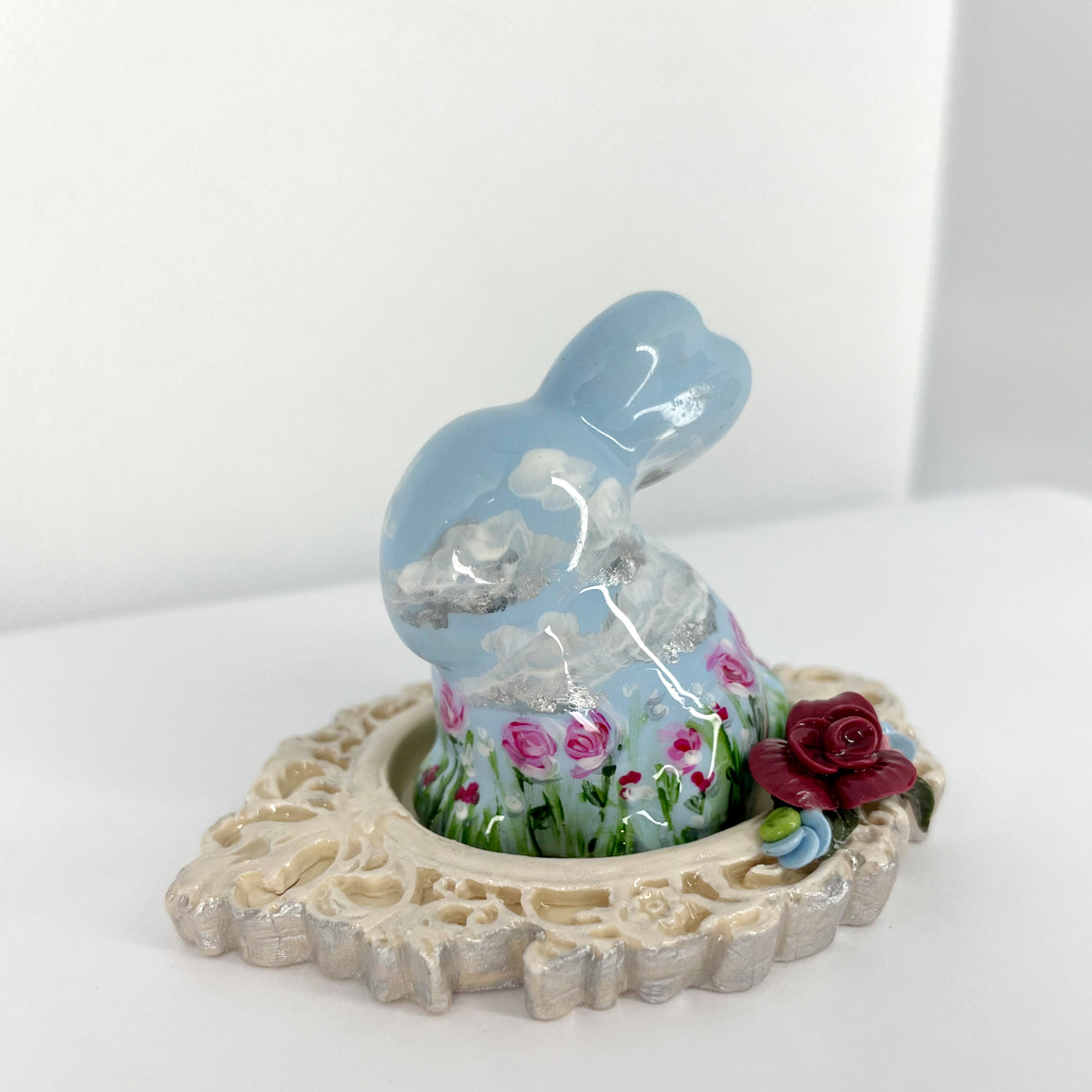 Bunny is approx 5 x 4 cm with gloss UV varnish. Antique style plate is 7.5 x 5.5 cm.
