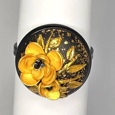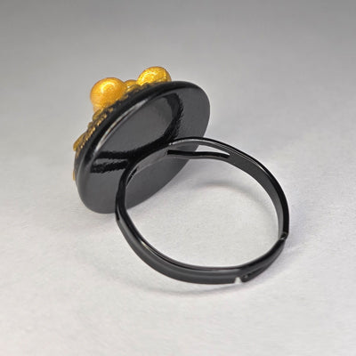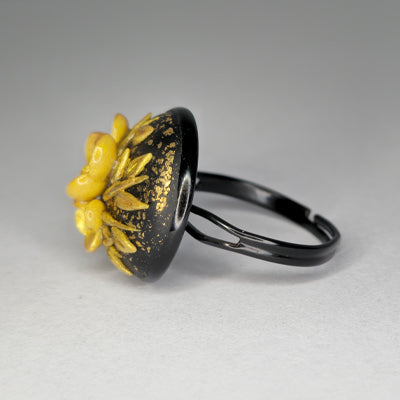 Caring for your polymer clay ring easy. To dust, use a soft clean makeup brush and lightly brush over it or run it under cold water and let it drip dry. Long exposure to water is not advised, however it is waterproof so you can wash your hands, have a shower or even go swimming. Whilst Polymer Clay is pretty sturdy once baked, it is still very fragile, never apply unnecessary pressure or tension to your item.