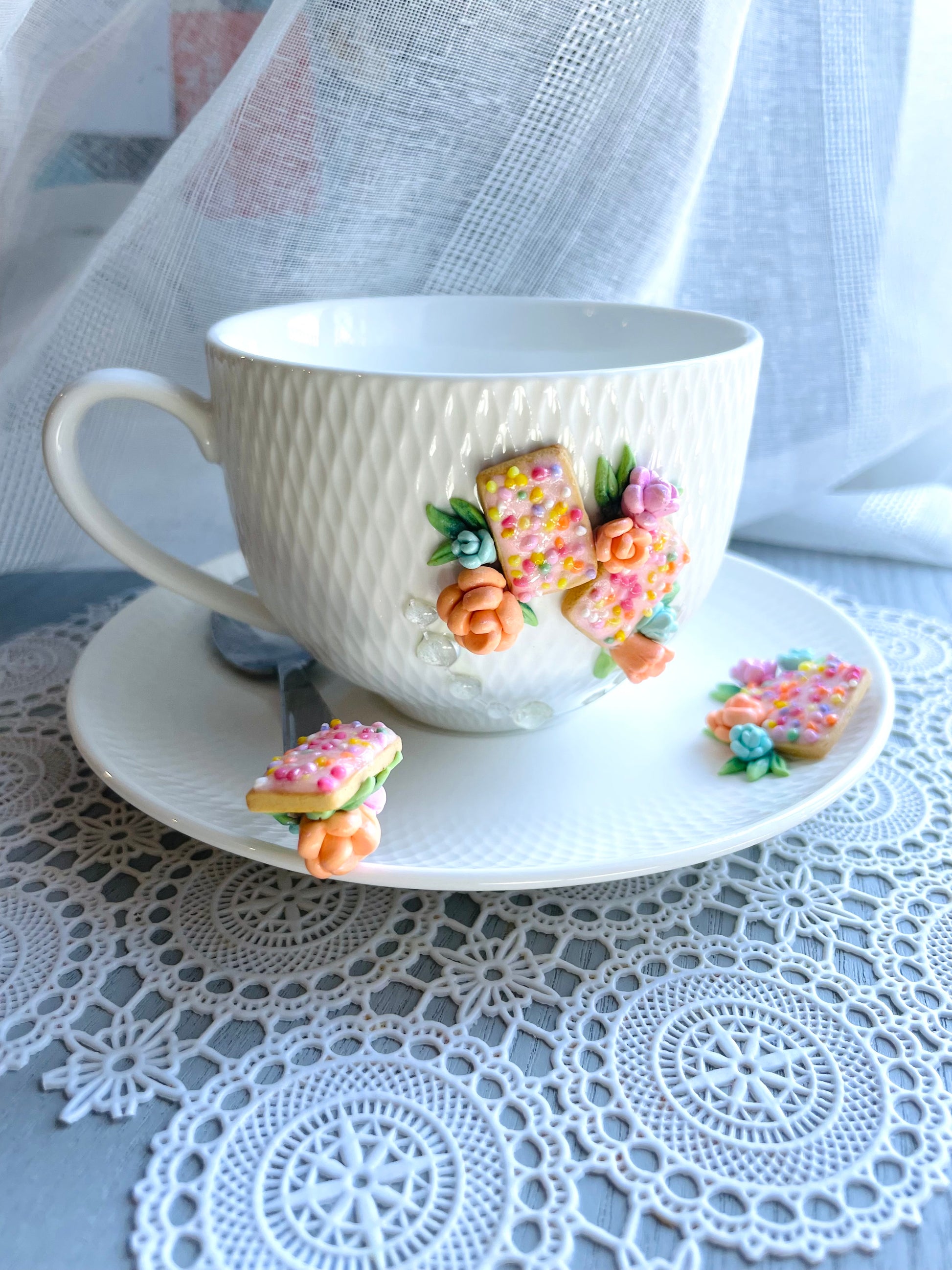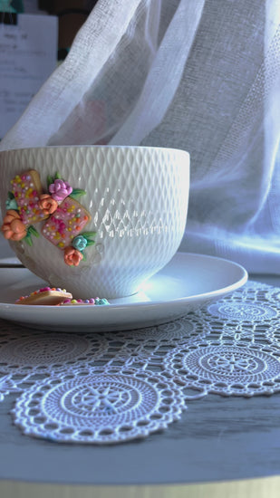 Caring for your polymer clay tea set is quite easy. Please do not place in microwave , oven or dishwasher. A gentle hand-wash with luke warm or cold water and a small amount of detergent, then let it air dry / drip dry. OR use a clean soft makeup brush to dust as required. Polymer clay is not food safe. Long exposure to water is not advised. Whilst Polymer Clay is somewhat sturdy, it is still very fragile, never apply unnecessary pressure or tension to any of the items.
