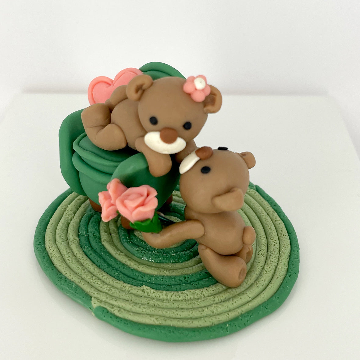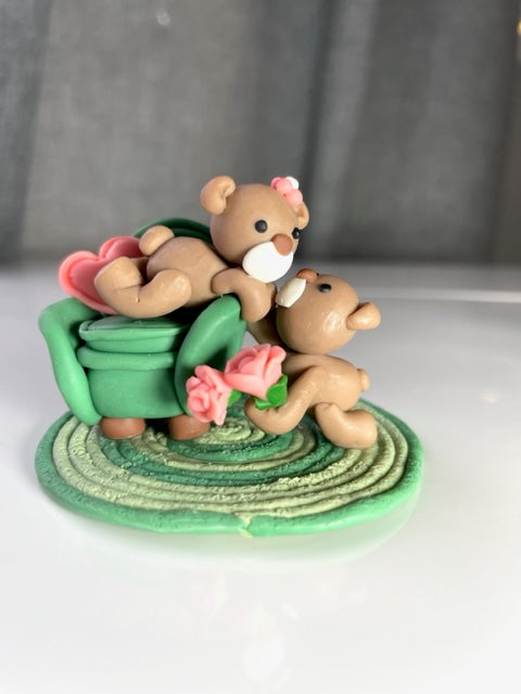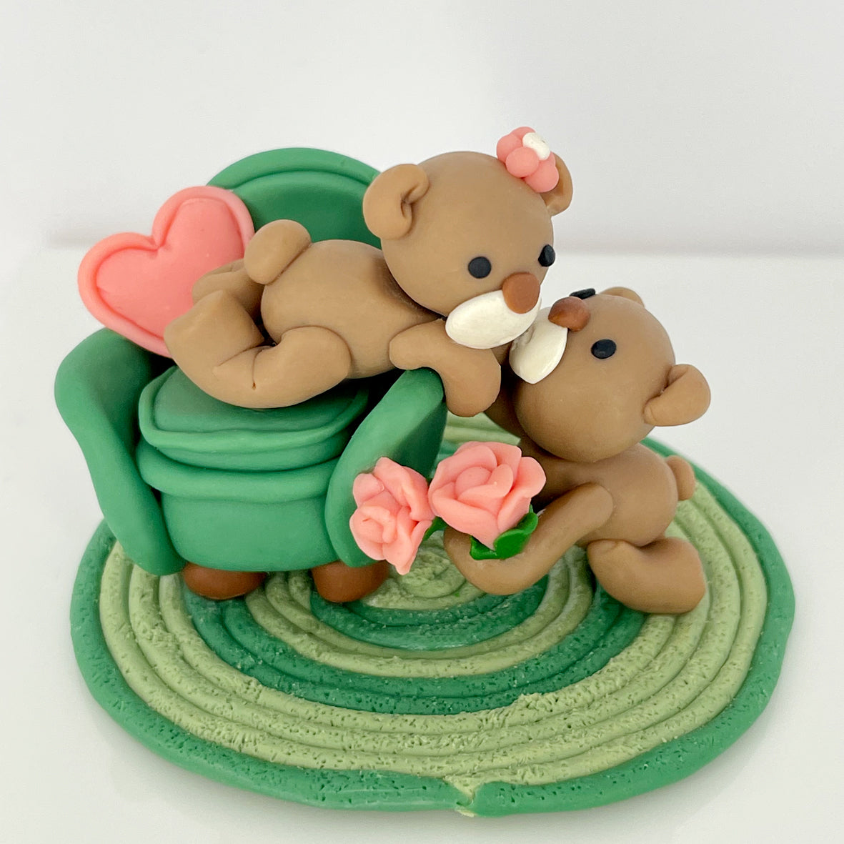 Two adorable bears on a vintage armchair. As he reaches up on his tippy toes to sneak a kiss on her cheek with pink roses in hand. Little sweethearts.