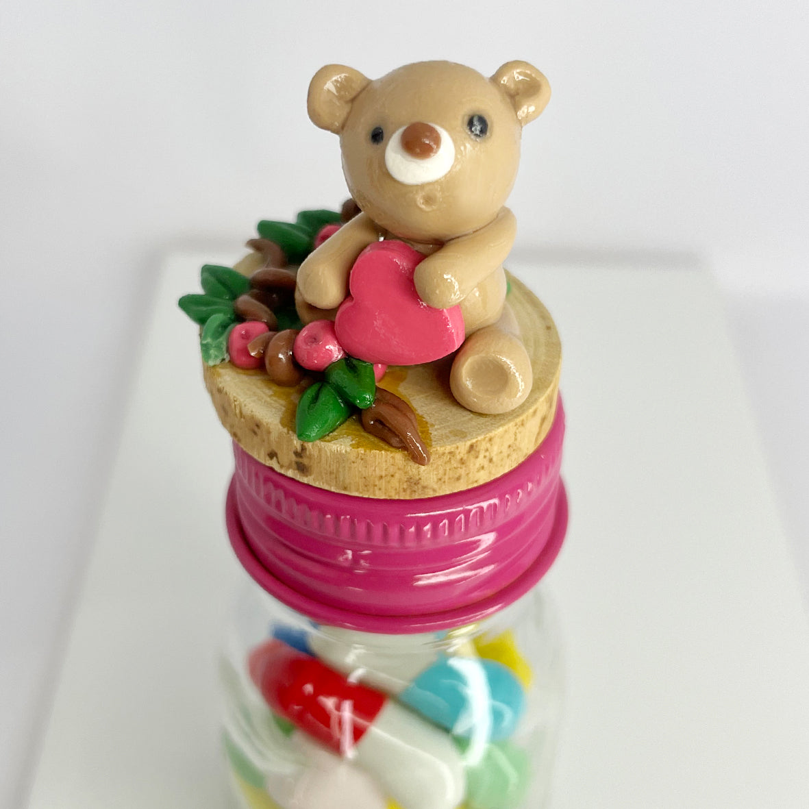 Small glass bottle (7cm tall) filled with mini message pills that have a blank piece of paper inside each pill to write your own personal messages.