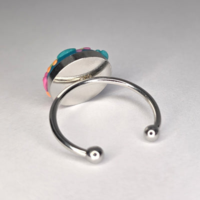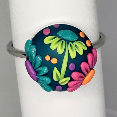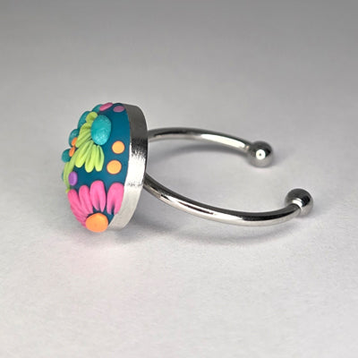 Caring for your polymer clay ring easy. To dust, use a soft clean makeup brush and lightly brush over it or run it under cold water and let it drip dry. Long exposure to water is not advised, however it is waterproof so you can wash your hands, have a shower or even go swimming. Whilst Polymer Clay is pretty sturdy once baked, it is still very fragile, never apply unnecessary pressure or tension to your item.