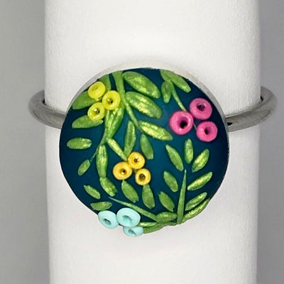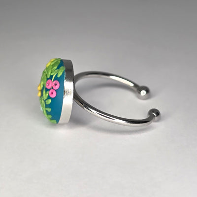 Caring for your polymer clay ring easy. To dust, use a soft clean makeup brush and lightly brush over it or run it under cold water and let it drip dry. Long exposure to water is not advised, however it is waterproof so you can wash your hands, have a shower or even go swimming. Whilst Polymer Clay is pretty sturdy once baked, it is still very fragile, never apply unnecessary pressure or tension to your item.